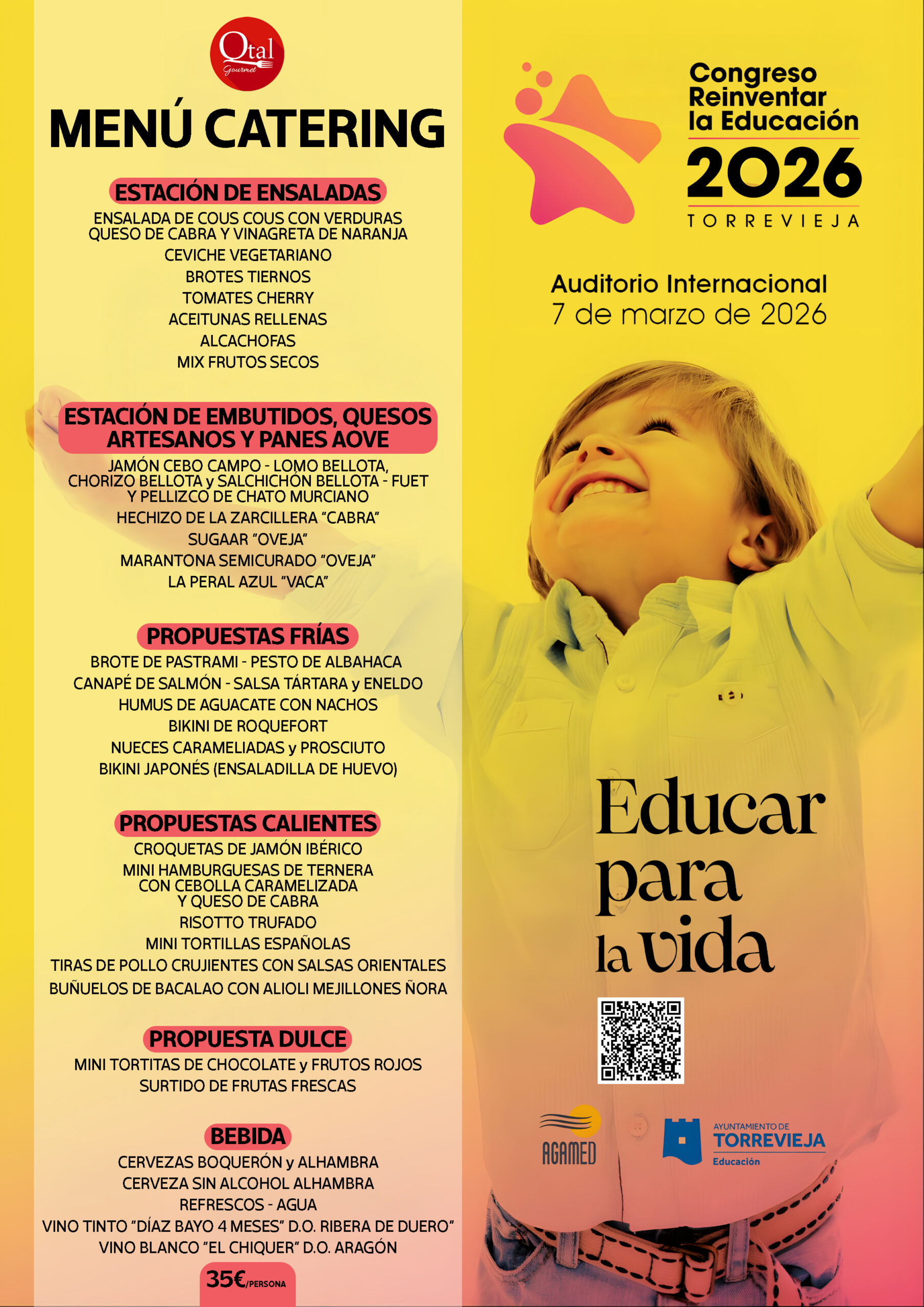 Next March 7, in the framework of the Congress “Reinventing Education” in the Auditorium of Torrevieja, a special catering organized by QTAL GOURMET will be served from 14:00 to 17:00 hours. The format will be with food served at tables, to ensure a more comfortable and relaxed experience.