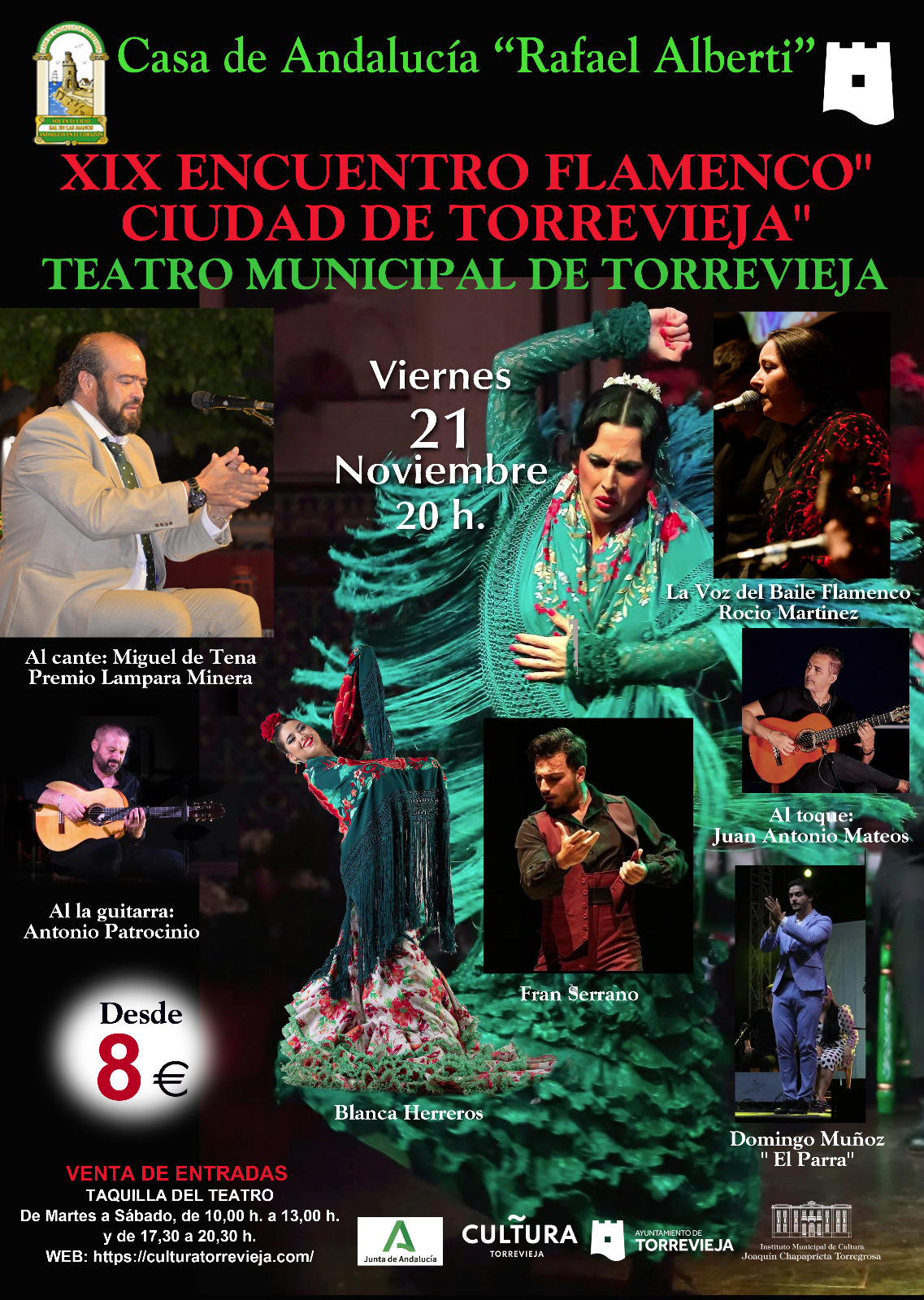 The event will feature Miguel de Tena, winner of the “Lampara Minera Award,” and “the voice of flamenco dance,” Rocío Martínez, on vocals; Juan Antonio Mateos and Domingo Muñoz “El Parra” on guitar; Antonio Patrocinio on guitar; and Fran Serrano and Blanca Herreros on dance.