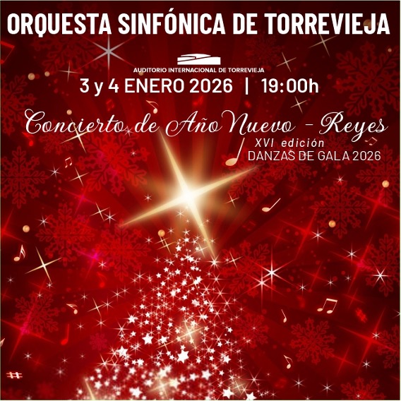 En sus dos sesiones del 3 y 4 de enero de 2026, la decimosexta edición del tradicional “Concierto de Año Nuevo – Reyes” de la Orquesta Sinfónica de Torrevieja nos traerá, como de costumbre, los clásicos valses y polkas, a la manera del famoso Concierto de Año Nuevo de Viena. Esta edición estará además dedicada a las danzas y tendrá algún guiño al mundo de la ópera.
