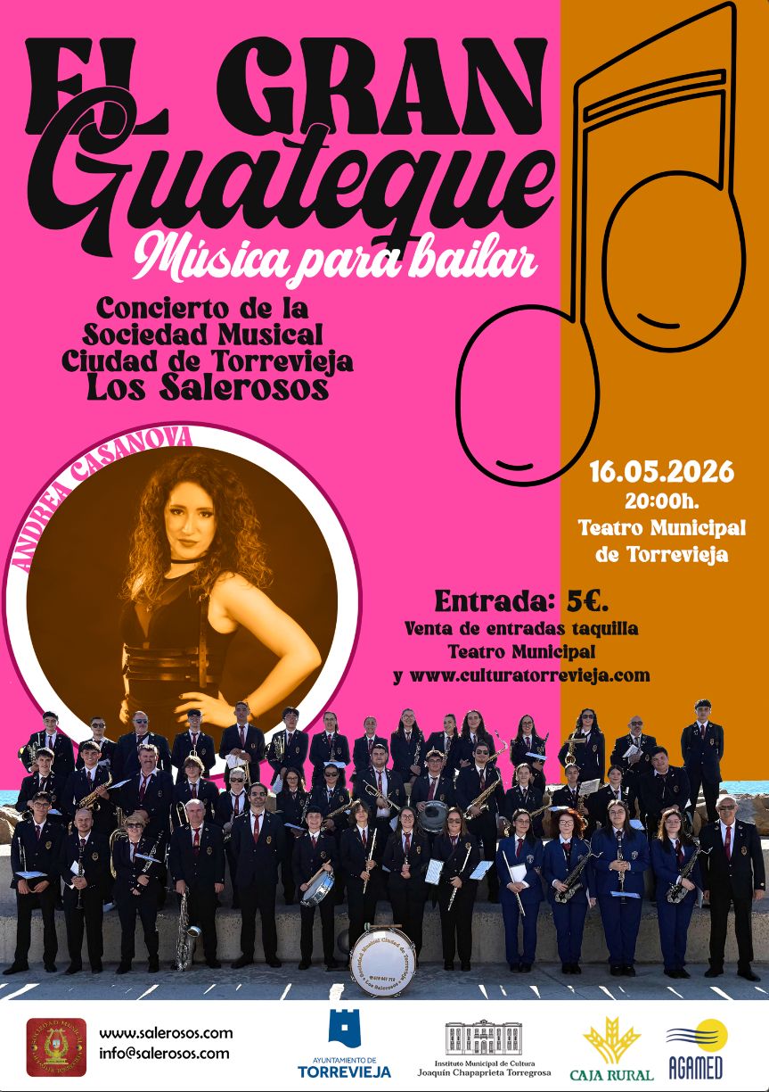 La Sociedad Musical Ciudad de Torrevieja “Los Salerosos”, junto al talento y la voz de la solista Andrea Casanova, te invitan a un espectáculo musical inolvidable lleno de energía.