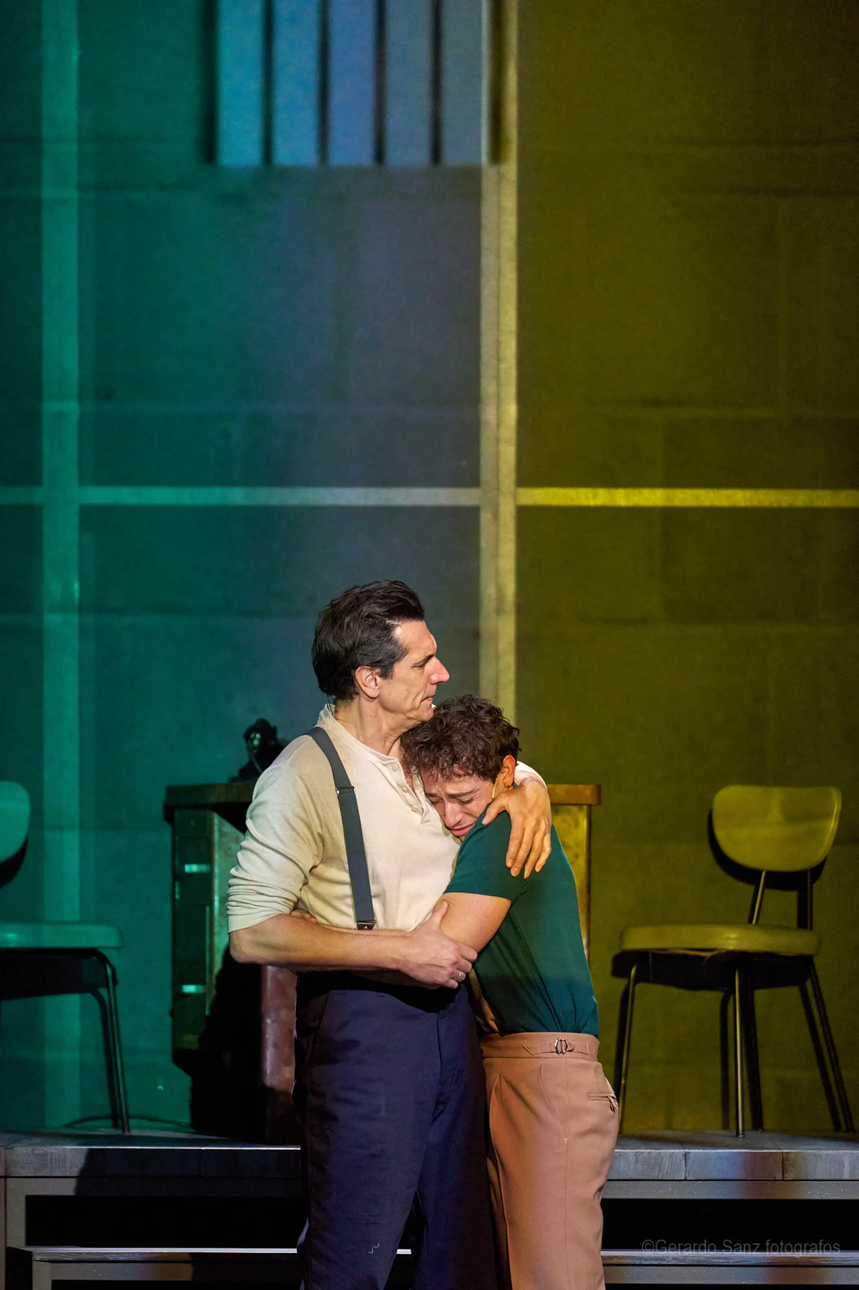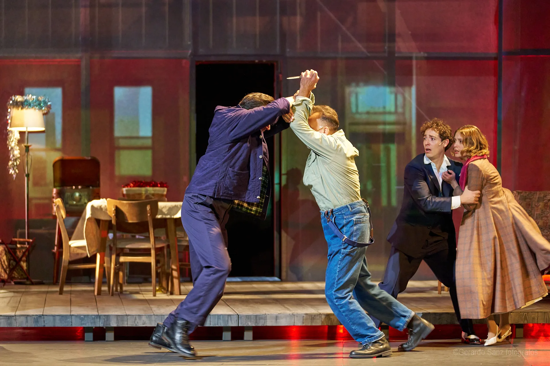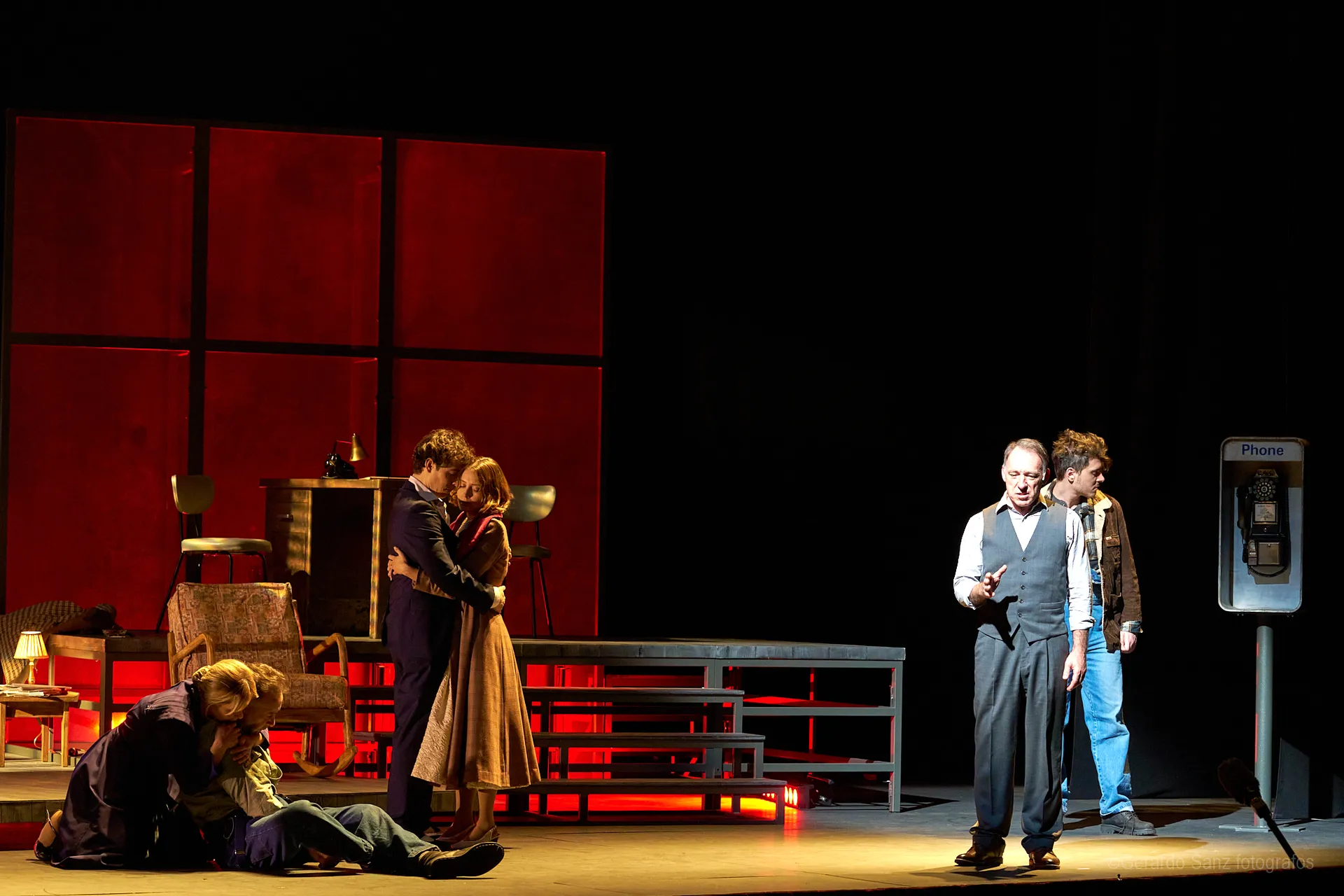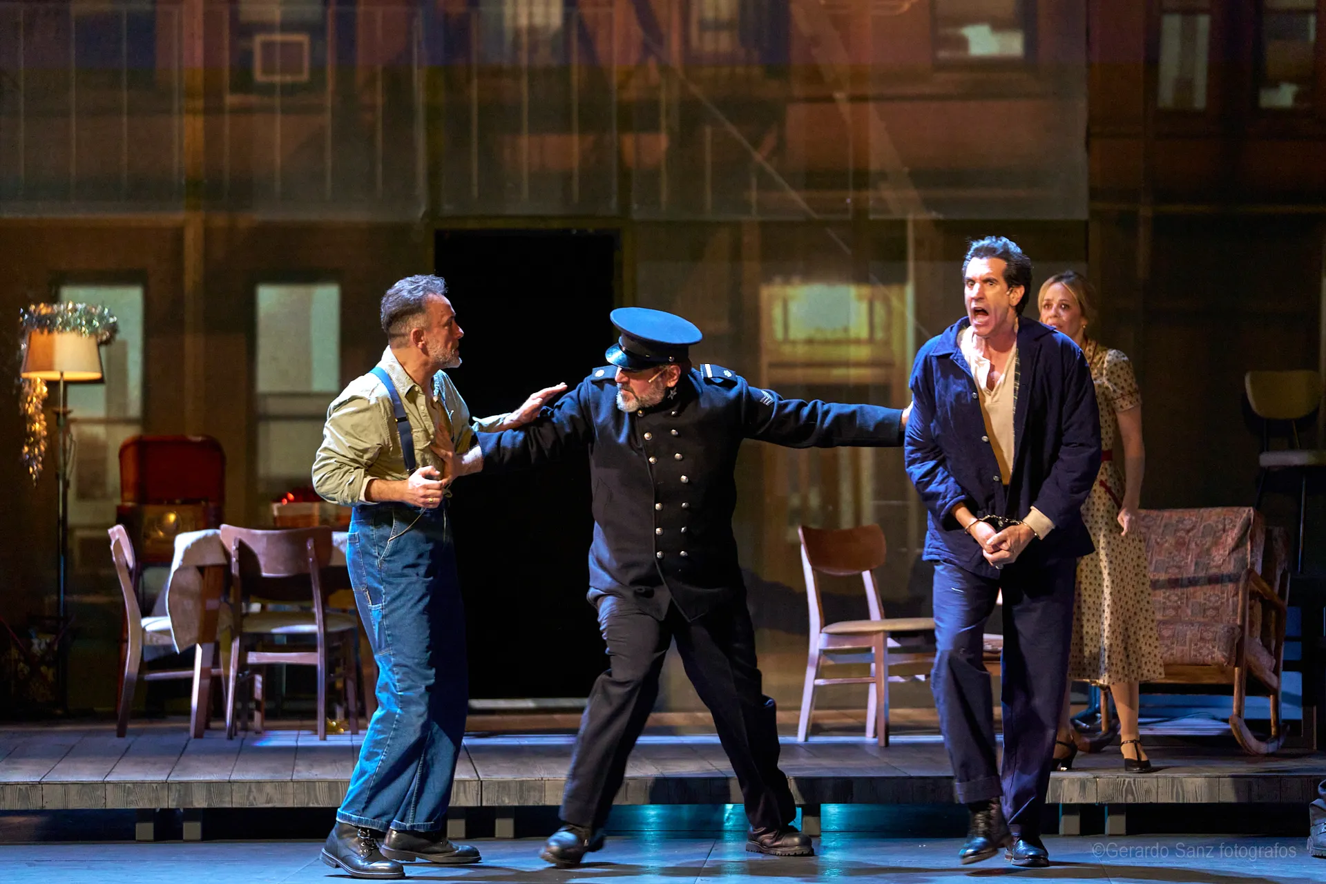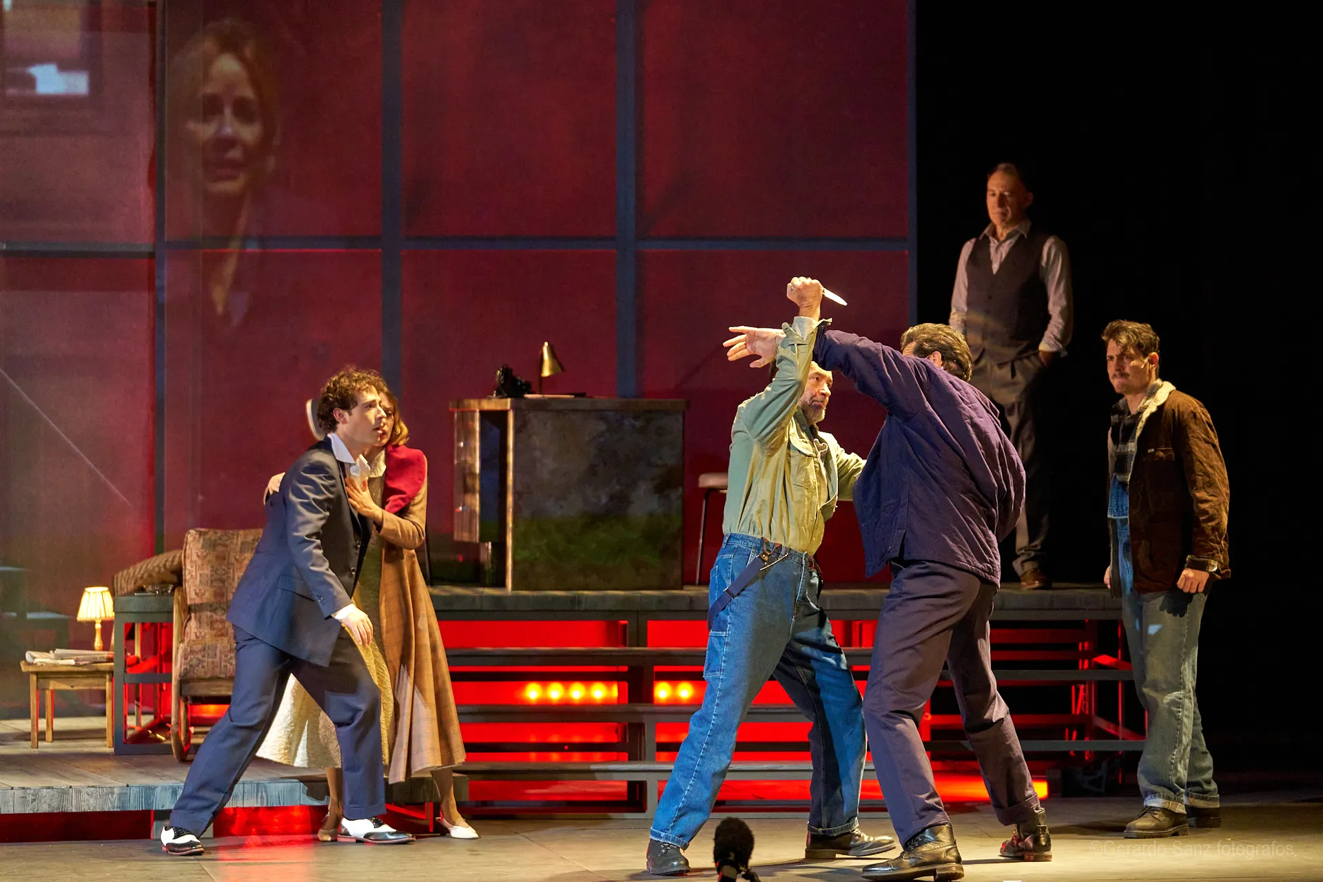 Nos centramos en el eje de Eddie: su relación fría (ha perdido el deseo) con su esposa Beatrice, con Catherine y con Rodolfo. Pero a ello hay que añadir el enfrentamiento brutal con Marco, el hermano mayor de Rodolfo. Contribuyen a la tragedia el abogado Alfieri (una especie de narrador omnisciente que todo lo sabe), el agente de inmigración y el coro de vecinos, que evolucionan de admirar a Eddie a abandonarlo y criticarlo cuando acusa a los italianos ante inmigración. En nuestra versión potenciamos el drama pasional, la conducta irracional que se deja dominar por el deseo, tal y como nos lo muestra Miller.