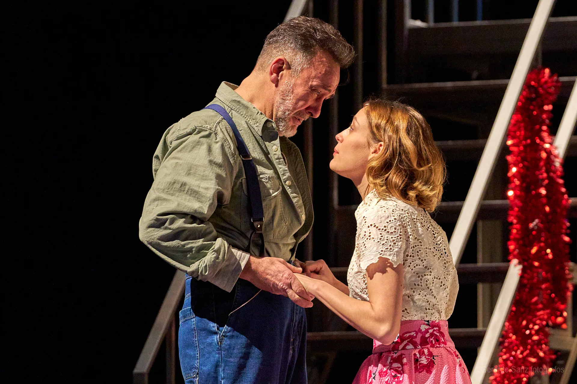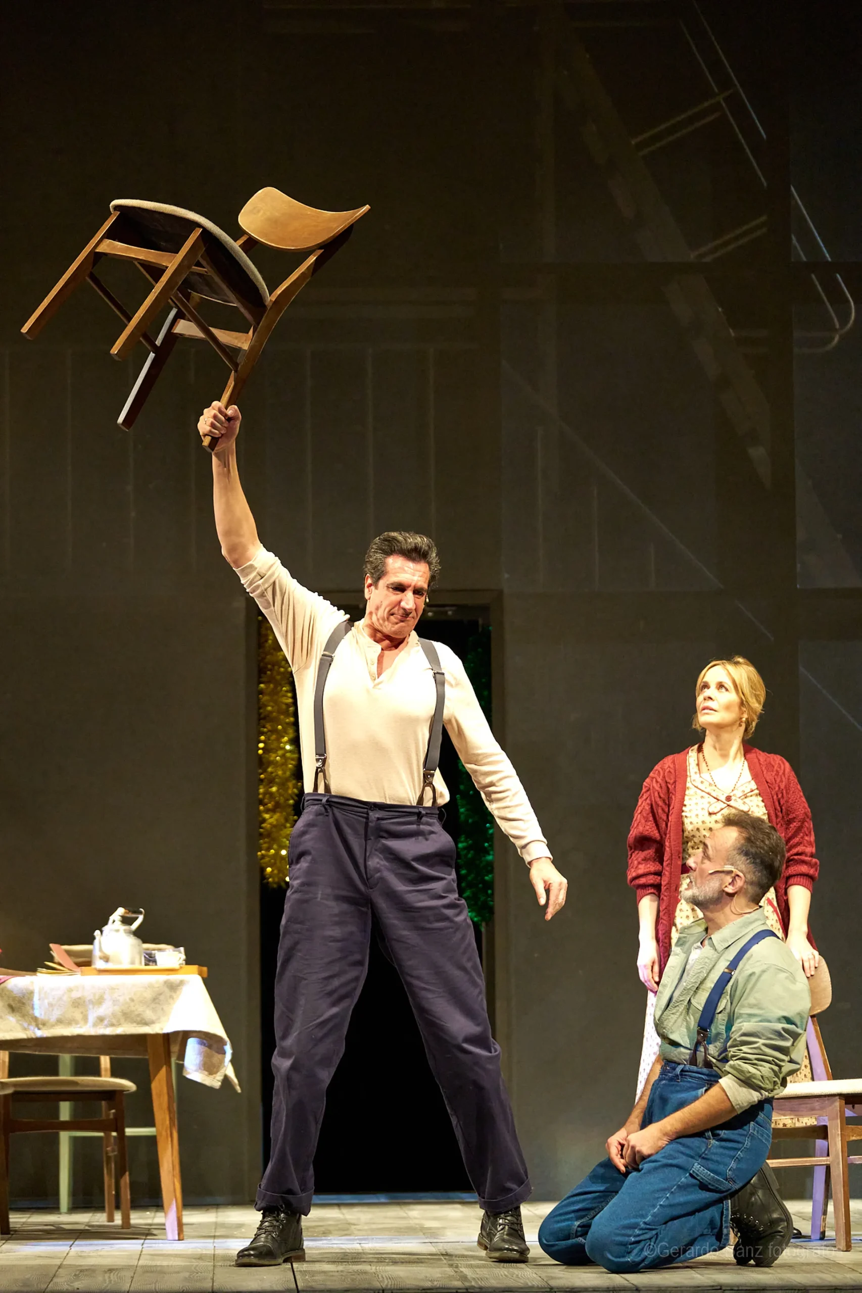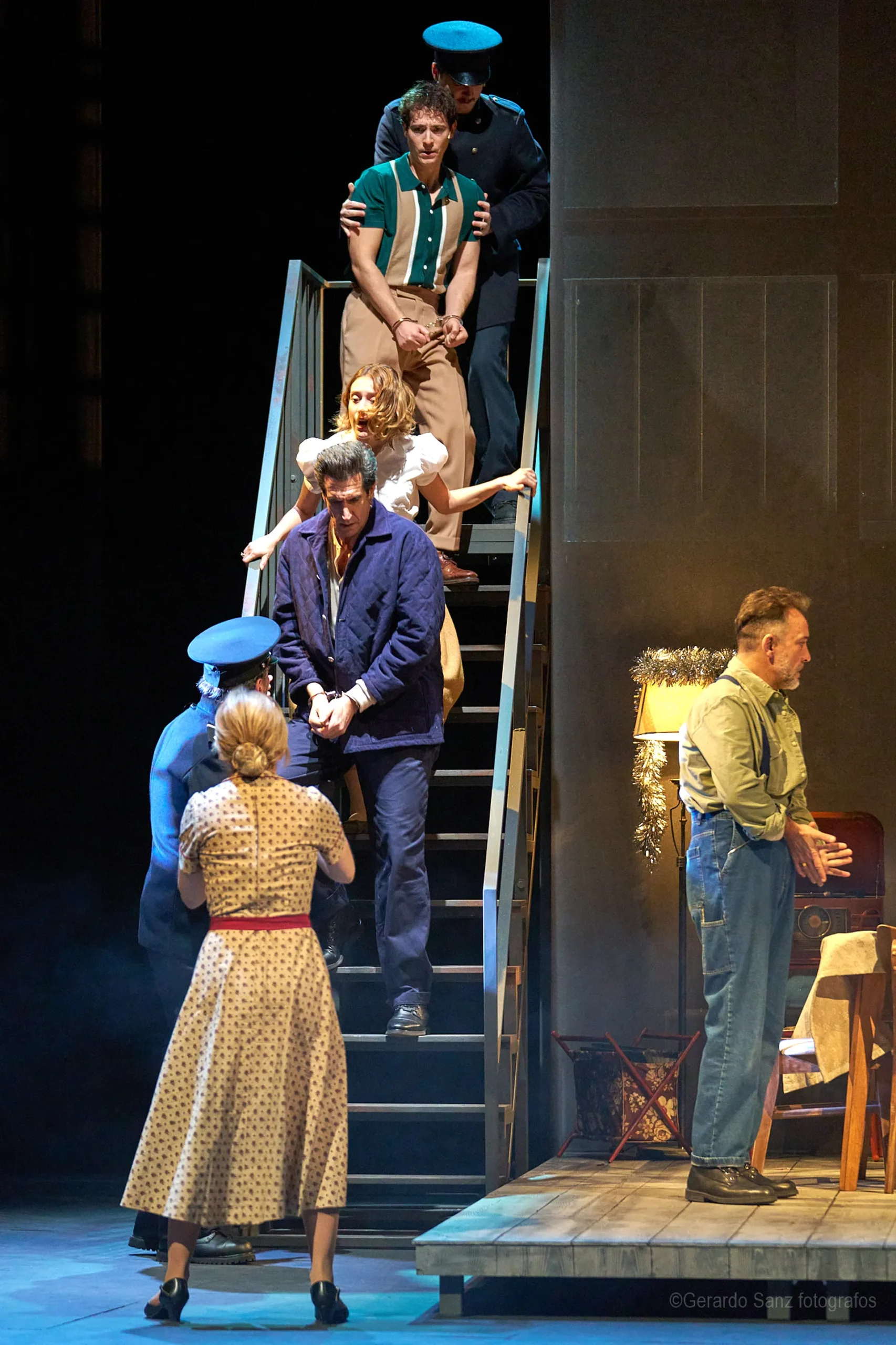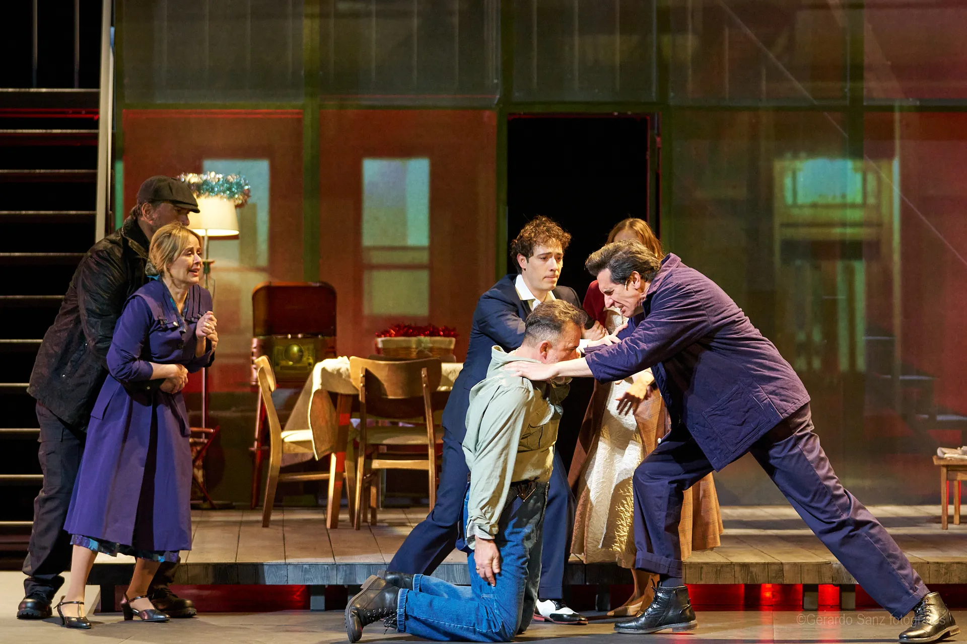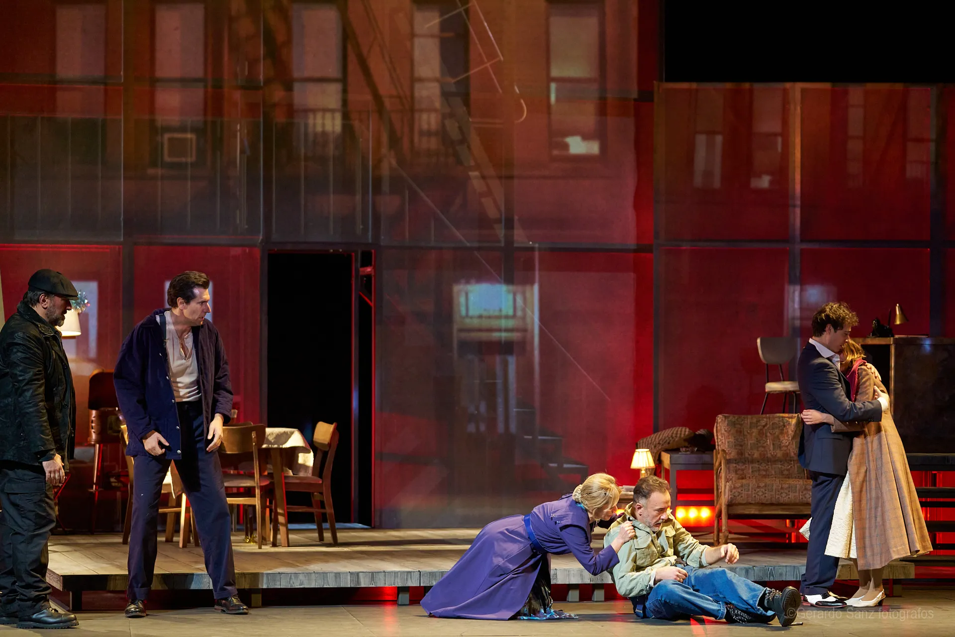 Nos centramos en el eje de Eddie: su relación fría (ha perdido el deseo) con su esposa Beatrice, con Catherine y con Rodolfo. Pero a ello hay que añadir el enfrentamiento brutal con Marco, el hermano mayor de Rodolfo. Contribuyen a la tragedia el abogado Alfieri (una especie de narrador omnisciente que todo lo sabe), el agente de inmigración y el coro de vecinos, que evolucionan de admirar a Eddie a abandonarlo y criticarlo cuando acusa a los italianos ante inmigración. En nuestra versión potenciamos el drama pasional, la conducta irracional que se deja dominar por el deseo, tal y como nos lo muestra Miller.